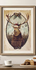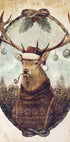 En stemningsfull juleplakat av Mike Koubou: en ettertenksom skoghjort med majestetiske gevir, innrammet av vintermørk skog og glimt av pynt. Retro fargepalett og subtil humor – et klassisk, nostalgisk blikk på julen, der natur, villhet og varme møtes. Et lite pipe-pust gir sjarmerende ro. Perfekt til rustikk vinterstemning i stue eller hytte.