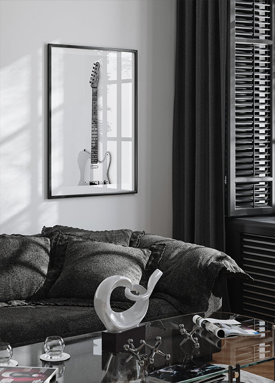 Et høy-key, svart-hvitt portrett av ren rock’n’roll: En gitarist lar en ikonisk Fender synge mot hvit bakgrunn, med strenger som vibrerer og lys som gnistrer. David Drake fanger øyeblikket der lyd blir bevegelse – minimalistisk, energisk og tidløst, perfekt for musikkelskere og kreative rom. Et blikkfang på veggen.