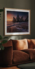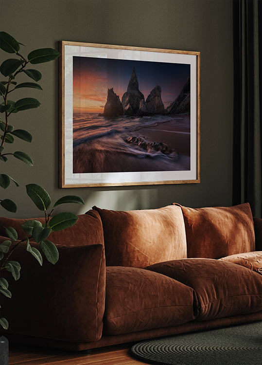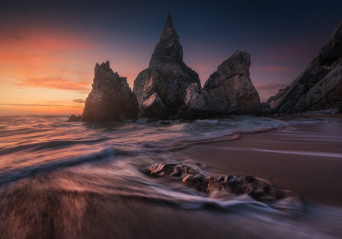 Praia da Ursa ved Sintra trer frem med dramatiske havstabler som skjærer gjennom Atlanterhavet, mens skumringen demper himmelen. En lang eksponering gjør bølgene silkemyke; varme solnedgangstoner glir over i dype blå og balanserer ro og kraft. Fotografert av kunstneren Carlos F. Turienzo. Fanget ved Lisboa-kysten i gyllent kveldsskjær.
