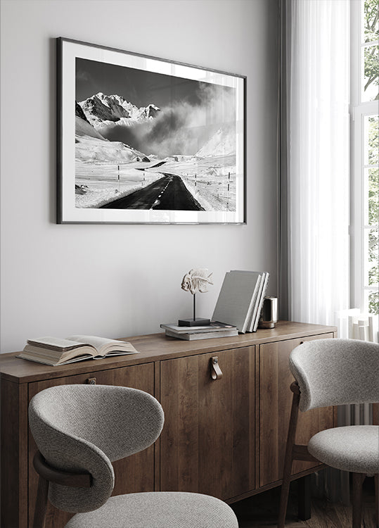 Venturing into the unknown av Alfredo Costanzo fanger en vinterlig fjellverden i monokrom: en enslig vei leder mot et hus i tåke og snø, mens alpetopper reiser seg i bakgrunnen. Stramme kontraster og dyp perspektivfølelse gir en tidløs, stille dramatikk som inviterer til ettertanke og eventyr. En hyllest til reiselyst.