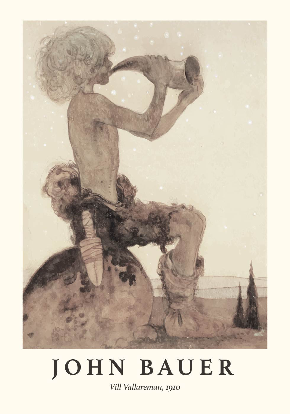 Denne fortryllende illustrasjonen av John Bauer, laget i 1910, viser en mytisk karakter som spiller på et horn i et rolig, drømmelignende landskap. Bauers karakteristiske stil kombinerer folklore med en myk, dempet palett som drar betrakteren inn i en magisk verden fylt med skandinavisk mystikk og undring.