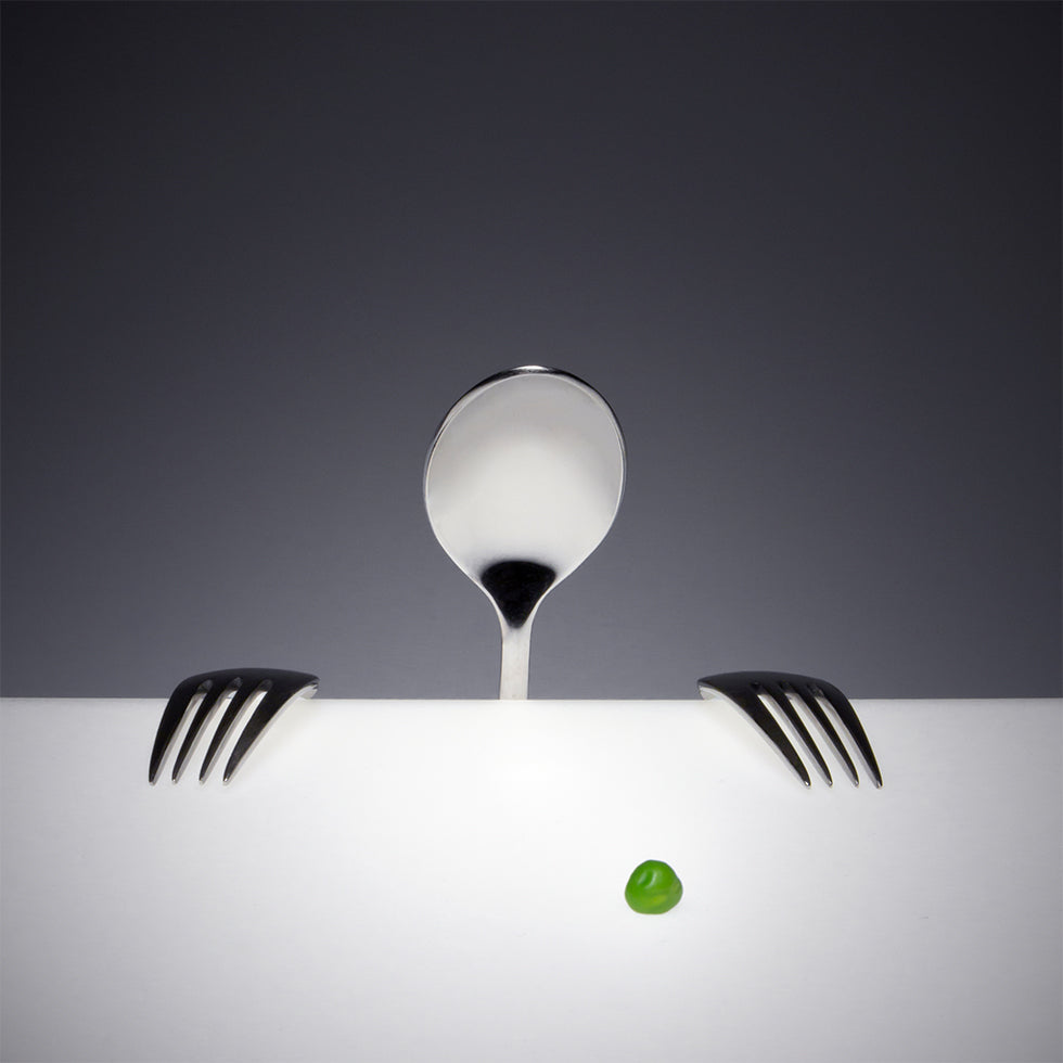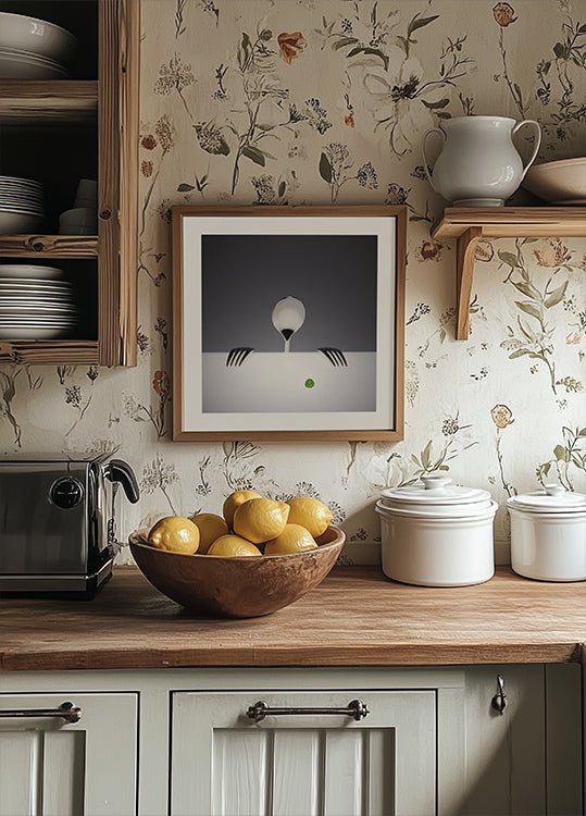 Playful and a little flirty, Want you... by Wieteke de Kogel turns cutlery into characters: a lone green pea teased by a longing fork and spoon. Clean lines, smart composition, and fresh green accents make this witty still life a charming conversation spark for kitchens and dining rooms and beyond.