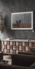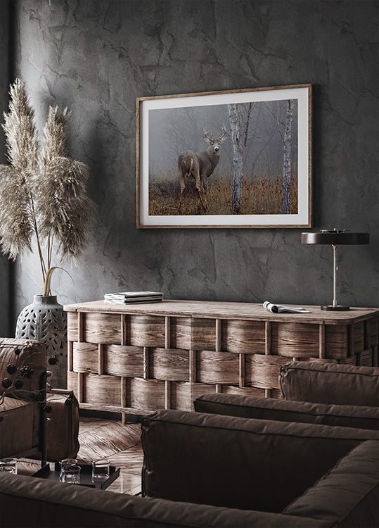 En imponerende fotoplakat av en majestetisk hjort som står årvåken i en tåkefull skog. Den myke disen og de dempede tonene fremhever styrke og eleganse, og fanger dyrelivets stille skjønnhet. Et slående veggbilde for naturinteresserte og rustikke hjem.