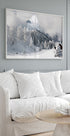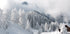 Et vakkert vinterlandskap i Alpene med høye, snødekte furutrær og fjell i det fjerne innhyllet i tåke. Scenen er lys og fredelig, med sollys som forsiktig belyser de frostede trærne. Nederst til høyre tilfører en rustikk trehytte en idyllisk sjarm til det rolige motivet. Bildet fanger magien av en stille vinteropplevelse i fjellene, perfekt for naturelskere og de som søker ro.