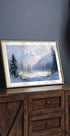 Et stemningsfullt vintermotiv i myke penselstrøk: snødekte åser, grantrær og en stille horisont badet i kjølig blått. Fine detaljer av fallende snø gir bildet bevegelse, mens den rolige komposisjonen inviterer til refleksjon. Et tidløst vinterlandskap som skaper ro, varme og julestemning i hjemmet. Perfekt hele året.