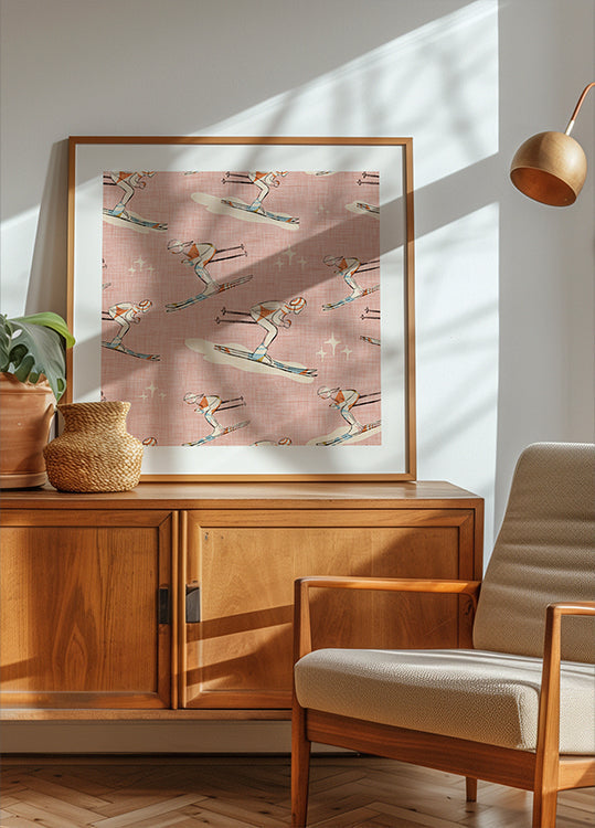 En retroinspirert skiplakat av Susana Costa i kjølige blåtoner: en dynamisk skiløper skjærer gjennom puddersnø under en solfylt vinterhimmel, med snøkledde, taggete fjell i bakgrunnen. Mørke grantrær og diskret vintage-typografi gir ekte mid-century reiselyst – både til hytteveggen og urbane hjem – et vinterfriskt blikkfang.