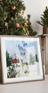 Et vintereventyr av Emel Tunaboylu: I en snødekt skog trår hjort og hare varsomt mellom frostglitrende trær, mens fjellene hviler i bakgrunnen og en liten hytte lyser varmt. Myke akvarelltoner og dansende snøfnugg skaper nordisk ro, julestemning og en poetisk pause i hjemmet. Perfekt til stue, hytte og barnerom.
